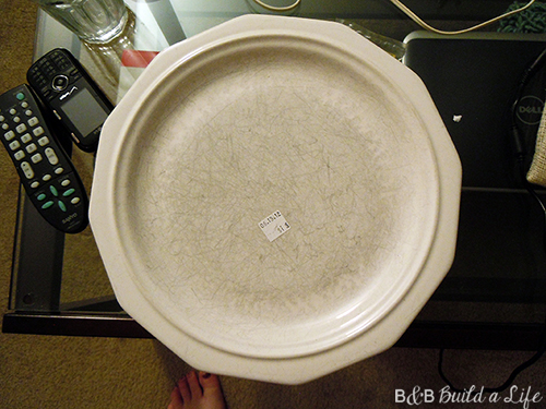 So the first two are of the same object – what basically looked like the neck of a pillar arrangement already. It was a whopping fifty cents. There was actually some hot glue stuck to the top so it was likely already part of something similar before. As for the plate, it was a dollar and had clearly seen better days. There were TONS of identical plates with the same scratch pattern. They were donated by an old diner that went out of business. No matter.