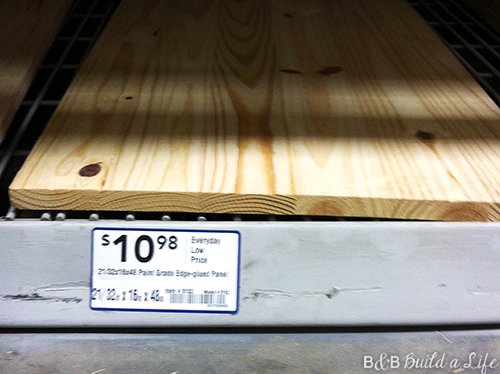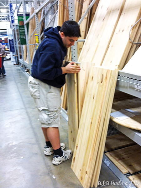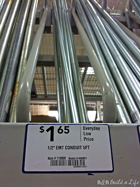 We had a basic sketch in hand, and aimlessly wandered the aisles of Lowes looking for materials that would work. We decided on electrical conduit piping for the hanging bar, and then we found this handy pre-fabbed pine for the body.