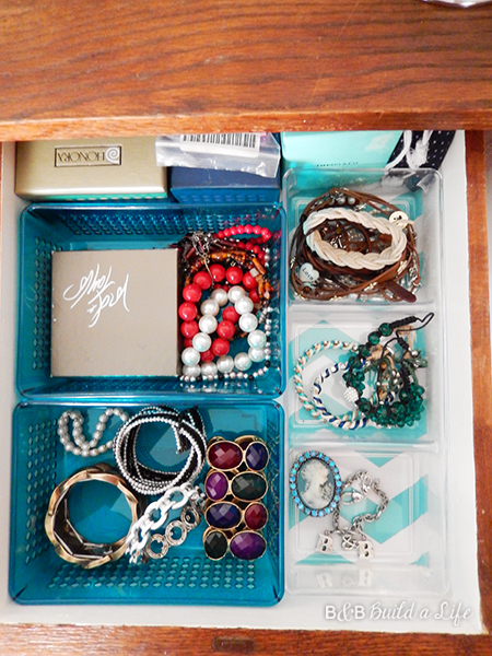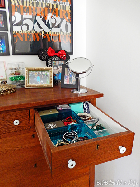 As for what’s ‘under the hood’, besides filling the drawers with my clothes (no, I’ll not bore you with how I fold my clothes into neat piles. Nobody cares THAT much…) I also picked up a few organizers for an accessory drawer. The two larger bins on the left side are from the Target Dollar Spot (woohoo cheap!) while the longer 3-sectioned one on the right was a few dollars more from the closet organizing section of the store. It’s perfect for keeping my bracelets and jewelry boxes organized.