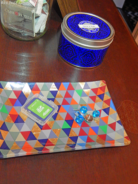 This little beauty called to me from the bottom of a clearance shelf at JC Penny. A store I NEVER go into…. but after the sweet scores Bill & I made on clothes on clearance for less than we’d pay for at a Goodwill, I think I may be going back! This tray was originally $26. TWENTYSIXDOLLARS?!?! For a little piece of glass?!? I mean, it’s uber cute and I’m kinda a fan, but it would never have gone home with me if it weren’t marked down to a measly $3.99. That’s a much better price for gold-leaf and fun colors to stow my tacks, loose change and whatever else I come across in my pockets.