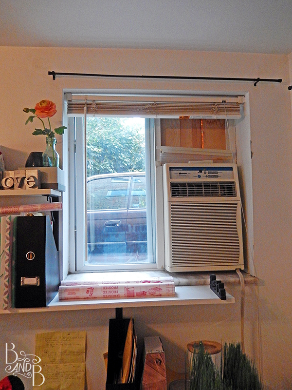Ahhhhhh, So much better than seeing our neighbors walking by. BUT, that still leaves our ugly air conditioner hanging out there. If this was our house and we had a garage or a basement we could store things like this in the winter, we would likely take it out seasonally. But this is apartment living, folks. We get ugly eye-sores all year long here! But, wanting to come up with a creative way to dress it up, like we did for the intercom panel, we brainstormed a bit. And the obvious option, was to include some fancy curtains.
