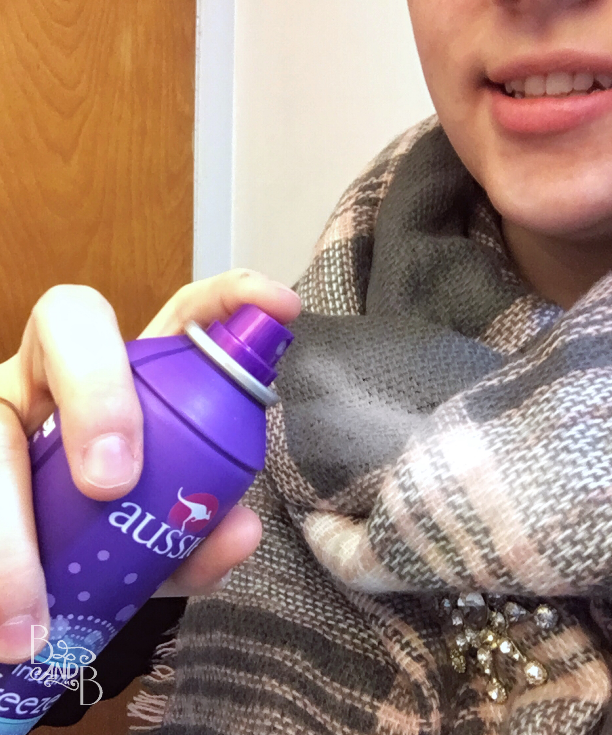 Now, zap the Scarf again with a coat of hairspray, targeting the areas nearest to your face where the fuzz is the most annoying. You’ll want to tilt your face away from the side of the Scarf you’re currently spraying for the best angle.