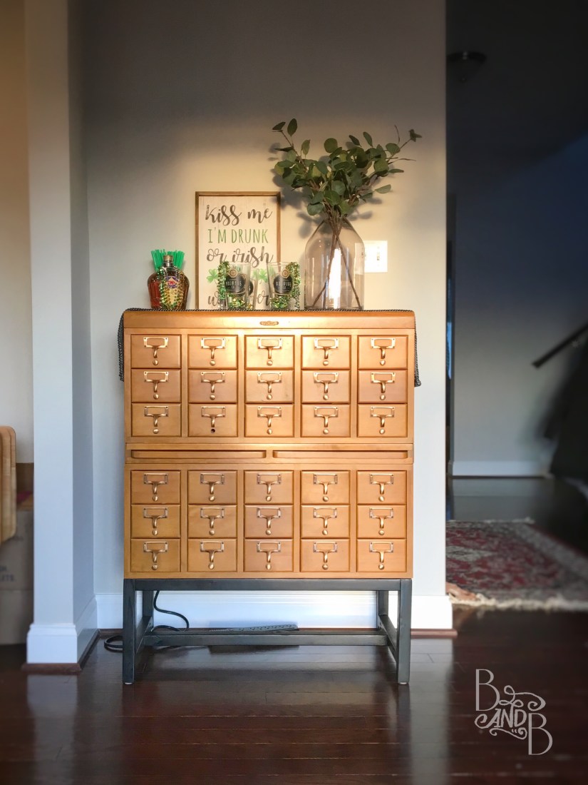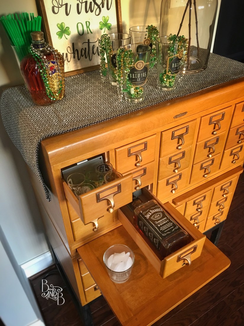 So here we are on the eve of St. Patrick’s Day having just finished our card-catalog bar. Or at least enough to use until we do some tweaking.