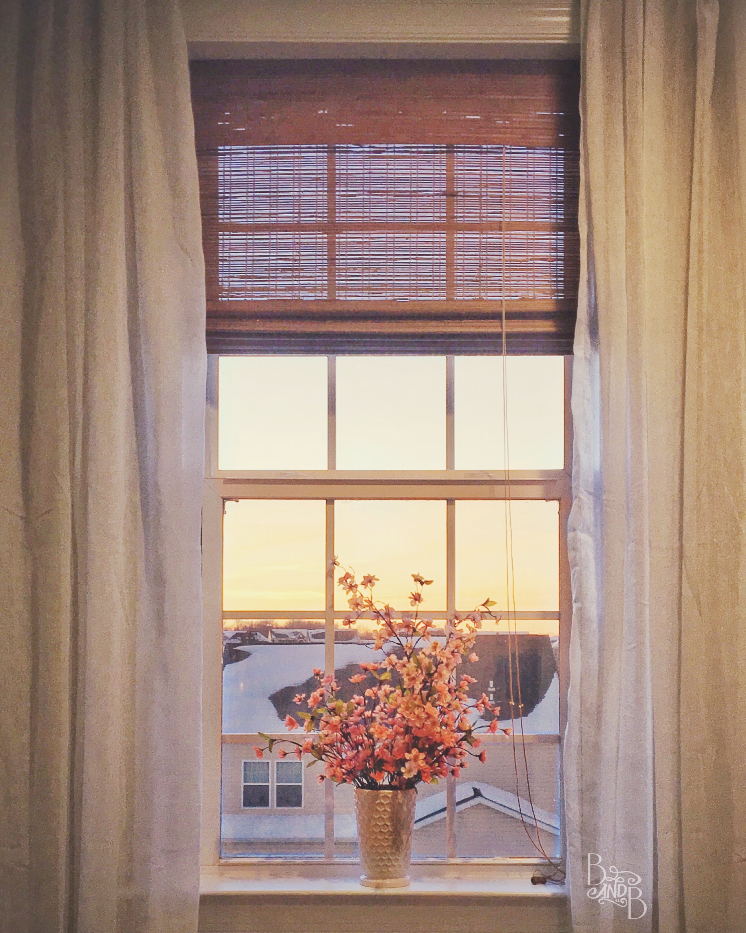 Our home is TALL. The first floor has airy 9ft ceilings and gets beautiful sunsets through our back windows. Speaking of windows, another thing you likely don’t plan for when building a new home is that you’ll have to purchase and install blinds and drapery for every.single.window. When you’re the first homeowner, there’s no previous owner to leave any behind. As was the trend in 2017, we purchased some inexpensive bamboo blinds on Amazon and screwed them directly into the window frames. While the white drapes around them have changed slightly, these still filter the sunlight in our living room today.