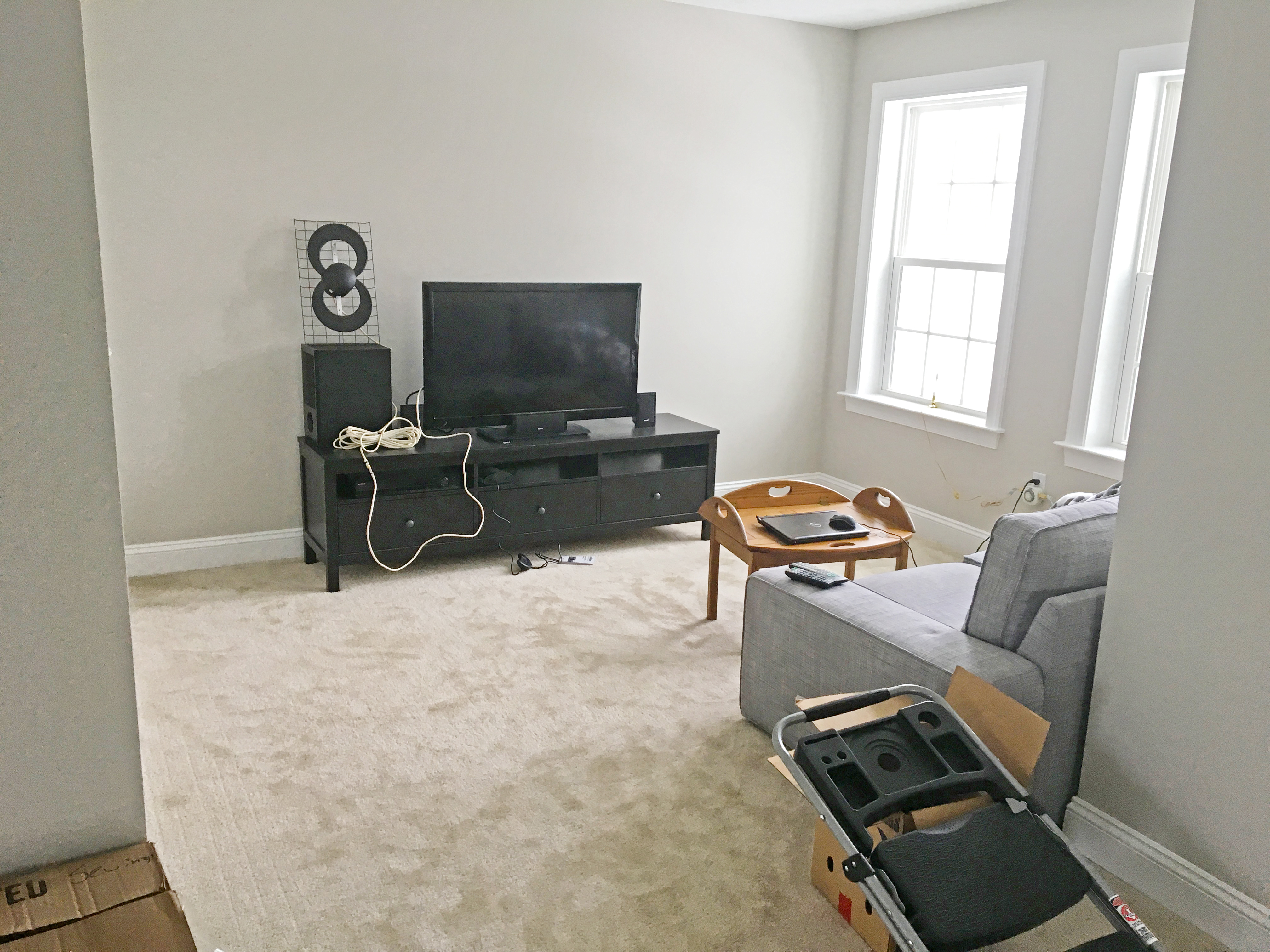 This loft space, located at the top of our stairs, fits our Expedit bookcase, hemnes tv stand, coffee table, and our apartment’s couch. While that sounds like a lot, it ultimately gave the space a very cozy feeling. This did mean our actual living room was left mostly empty as we planned the space. Yes, that’s our ceremonial ‘first meal in the house’ pizza on propped on boxes in the photo below.
